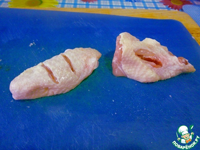 Оставшееся крыло разделить пополам по суставу. Среднюю часть надрезать поперек с двух сторон, а в верхней, более крупной части крыла сделать продольный надрез. Это нужно для лучшей пропитки мяса маринадом.