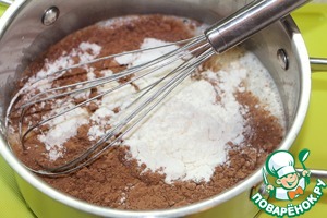 Добавить какао порошок и муку. Перемешать, чтобы не было комочков.