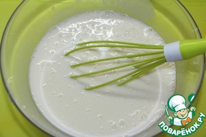 Смешать молоко, пиво, яйца, сахар, растительное масло Олейна и растопленное сливочное масло. Взбить до растворения сахара.
