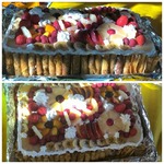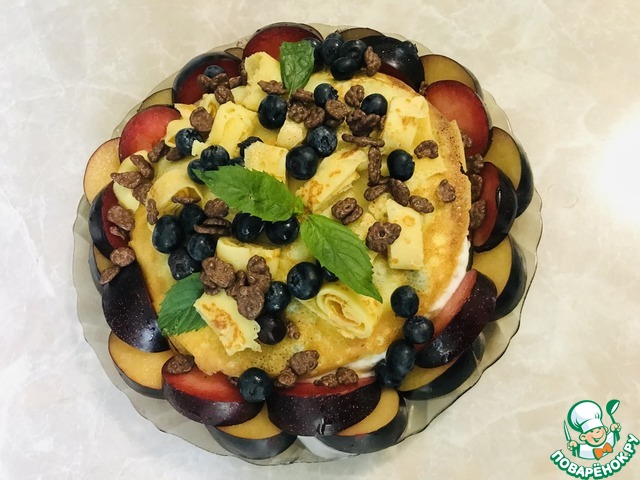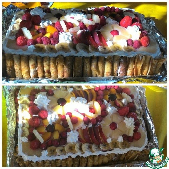 внутри торта блинчики с начинкой (два слоя - карамелизированные бананы, третий слой - малина и крыжовник, протертые с сахаром) завернуты трубочками и уложены горизонтально в несколько слоев. Каждый слой промазан вашим кремом, сверху тоже он + тонкий слой просто взбитых сливок. И фрукты)
