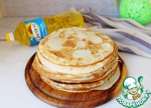 Испечь тоненькие блины по вашему рецепту с добавлением растительного масла "Олейна".