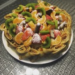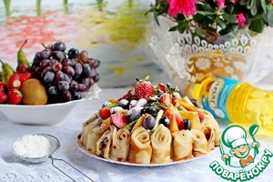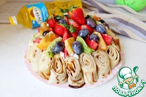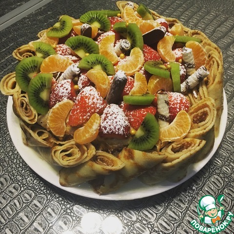 Нарядный, вкусный, тортик из блинов с изобилием фруктов можно приготовить как и в масленичную неделю так и в летнее время, когда фрукты и ягоды будут в изобилии. Именно сейчас, в холодную пору так хочется немного лета, ягод, фруктов.. Конечно этот тортик можно украсить сезонными фруктами, можно взять грушу, яблоко, хурму киви, цитрусовые...