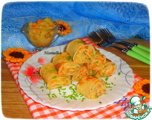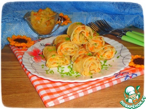 Сворачиваем в рулетик. Рулетики порезать на несколько частей и подать к столу. Очень вкусно с супом!