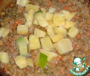 Через 5 минут добавить порезанный кубиками кабачок. Перемешать. Протушить 10 минут.