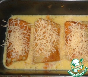 Сверху посыпать тертым сыром. Запечь блины в духовке при 180 градусах (20-25 минут).
