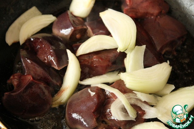 Печень, лук и морковь нарезать, обжарить на растительном масле "Олейна". Не солить, налить немного воды, накрыть крышкой и потушить до готовности моркови (у меня морковь неожиданно закончилась, поэтому на фото ее нет)))