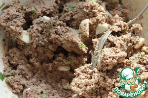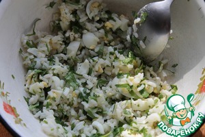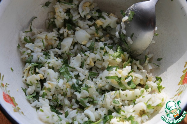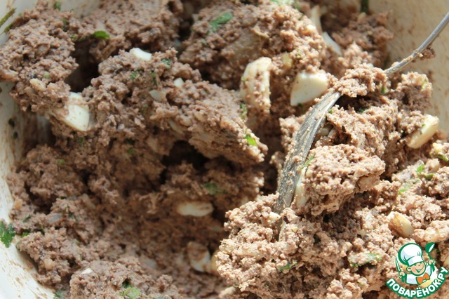 Готовую печень с овощами перекрутить на мясорубке или в блендере. Посолить, поперчить, добавить размягченное сливочное масло и смешать с рисом и яйцами.