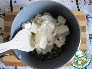 Постоянно помешивая, доведём смесь до однородного состояния. Приправим чёрным перцем. Теперь самое время попробовать получившуюся начинку: если слишком солёно-добавляем сметану, если пресно-добавляем соль. После добавления соли или сметаны, прогреваем начинку ещё пару минут, снимаем с огня и даём остыть.
