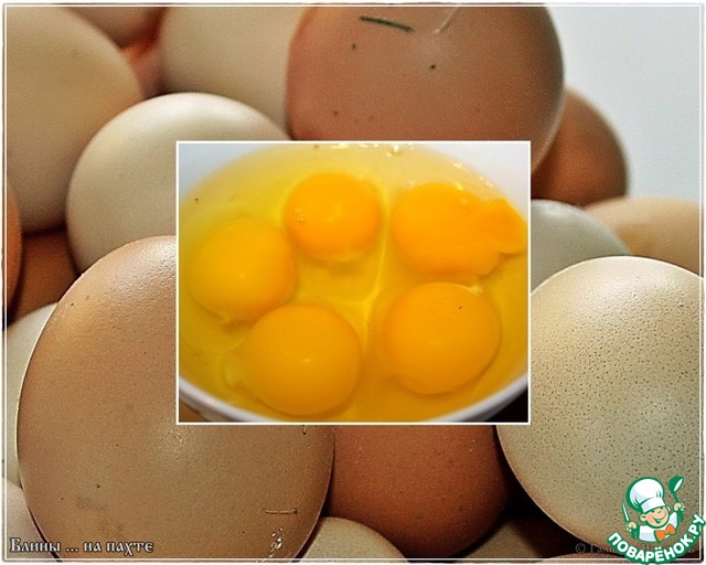 Нужно четыре яйца. Да, я не ошибся и до пяти считать не разучился. Разбивал четыре яйца, а желтков оказалось пять. Как это нынче говорят: «бонус» от Рябы за хорошее питание - два желтка в одной скорлупке!