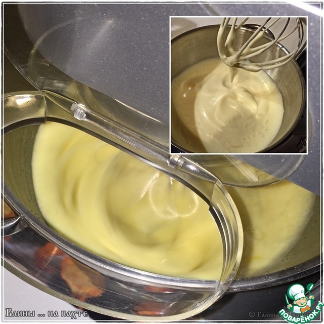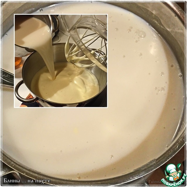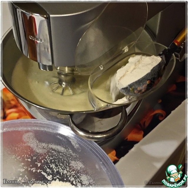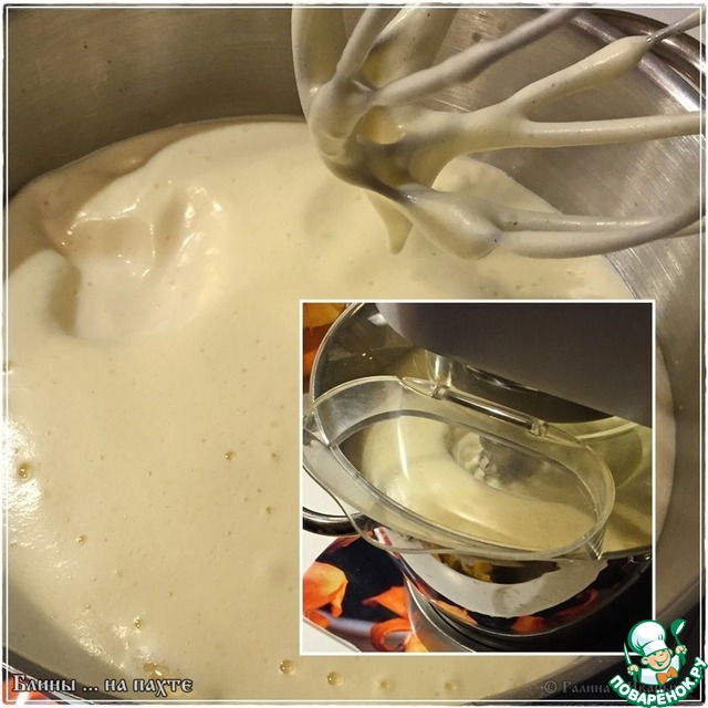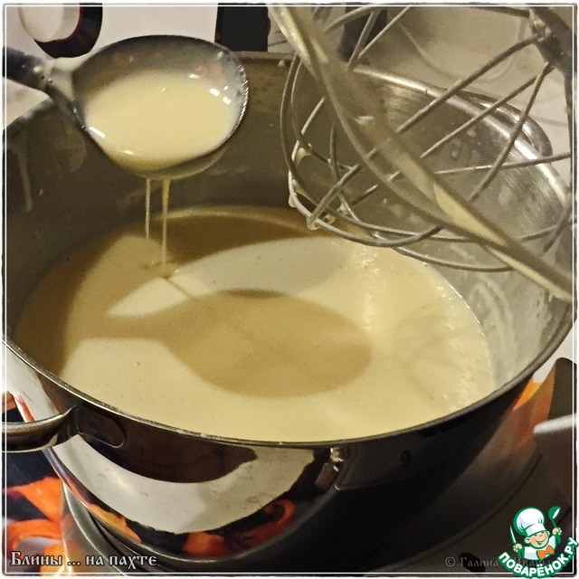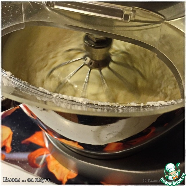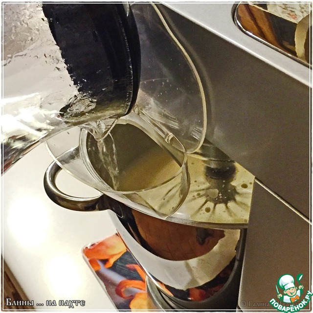 А потом добавить немного кипятка в тесто. Мешалка, замечу, вращается. Кипяток вливается тонкой струйкой. По объёму – примерно граммов около ста. Зачем? А чтобы блины не рвались, когда из этого теста их жарить будем.