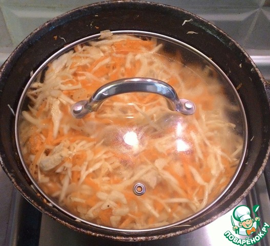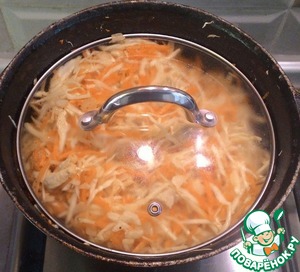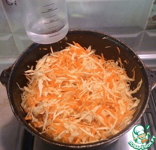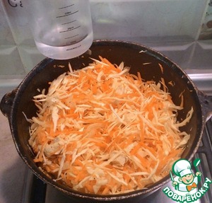 Добавить тыкву, капусту. Перемешать. Посолить и поперчить по вкусу. Влить 100 мл горячей воды.