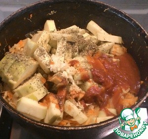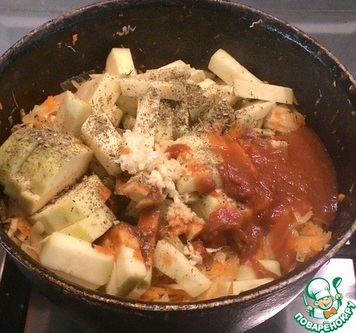 Добавить кабачок, кетчуп или томатный соус. Добавить смесь специй и чеснок пропущенный через пресс.