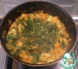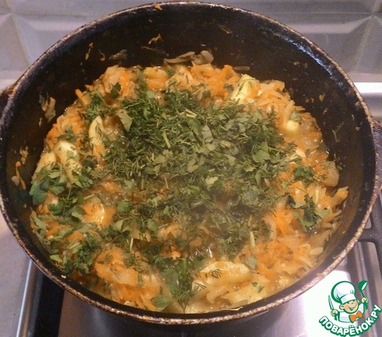 Тушить под крышкой 10 мин. За пару минут до готовности добавить порезанную зелень.