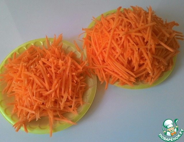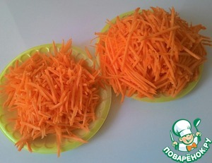 Морковь и тыкву порезать тонкими брусочками или натереть на терке для корейской моркови.