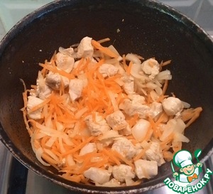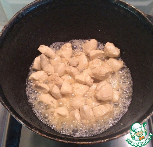 Разогреть в казане или сотейнике 3 ст. л. растительного масла и на сильном огне обжарить курицу - 4-5 мин.