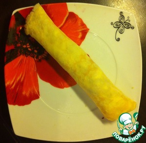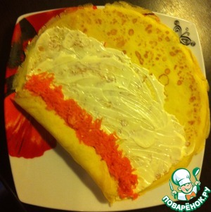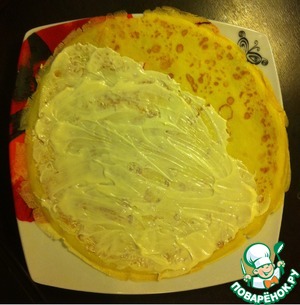 Готовый блинчик слегка смазываем майонезом (если любите майонез – смазывайте щедро) и начинаем выкладывать нашу начинку.