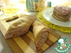 Рулет сделала из 3-х блинов, каждый блин промазала и завернула один-в-один. Блины-сердечки выложила стопкой, промазывая каждый блин. Дала постоять и подала.