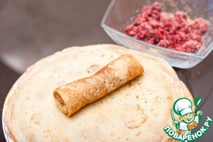 На край блинчика положите дорожку из вишен