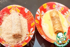Обмакните каждый блинчик сначала в яйце, затем в сухарях