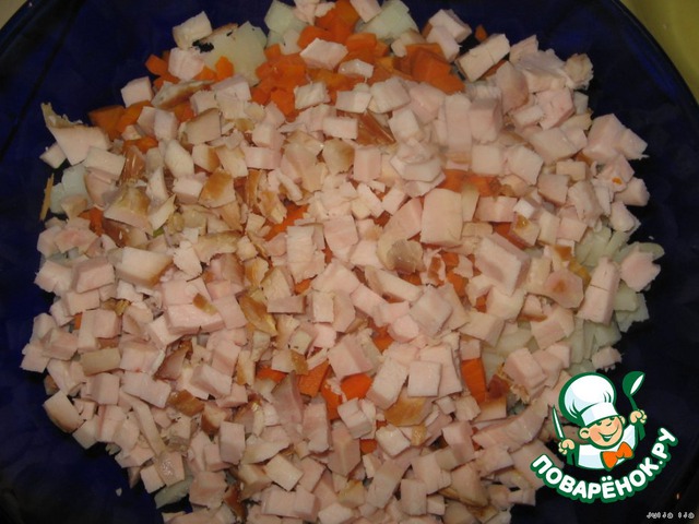 - Мясо (колбаса, ветчина, мясо, курица, карбонат, буженина, язык - любое мясо) — 200 г