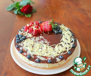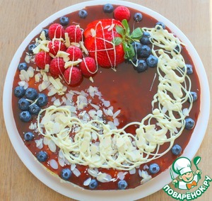 Украсить ягодами белым шоколадом и миндальными лепестками или по своему вкусу.