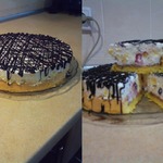 Дно бисквита смазать шоколадной массой и нанести тонкий слой желатиновой массы.