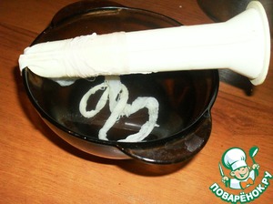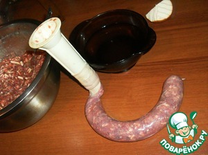 Вымоченую и промытую кишку натянуть на приспособление для изготовления колбас. Если такого не имеется, обрежьте пластиковую бутылку и оденьте кишку на горлышко. Конец кишки завязать узлом или ниткой.