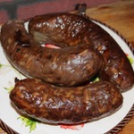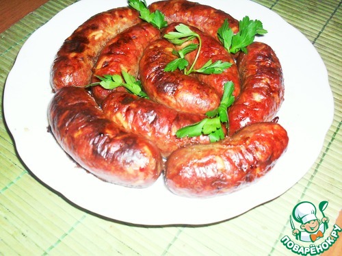 Набитую кишку в нескольких местах перекрутить через 10-12 см. Образуя таким способом шпикачки. Каждую шпикачку проколоть иголкой или зубочисткой в нескольких местах. Выложить на, смазанную слегка маслом, сковородку и запечь в духовке около 40 минут. Температура 180*-200*