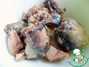 Выложить рыбные консервы в тарелку без жидкости от них. Измельчить вилкой в однородную массу.