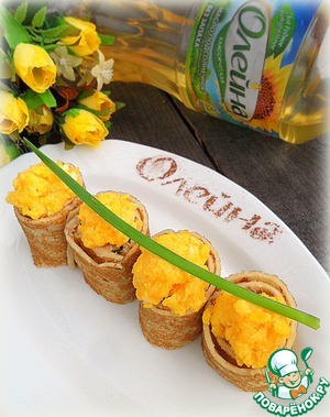 Все перемешать, выложить на блин, свернуть трубочкой.