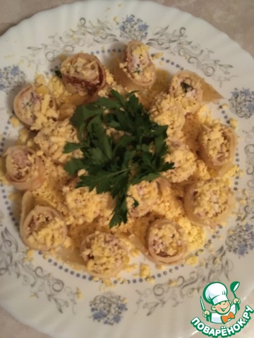 Разрезать трубочку на 4 части, поставить кусочки на тарелку, сверху украсить измельченным желтком.