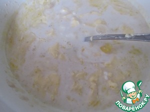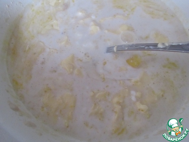 Добавляем сметану, мягкое сливочное масло, желток, соль и крахмал разведенный водой.