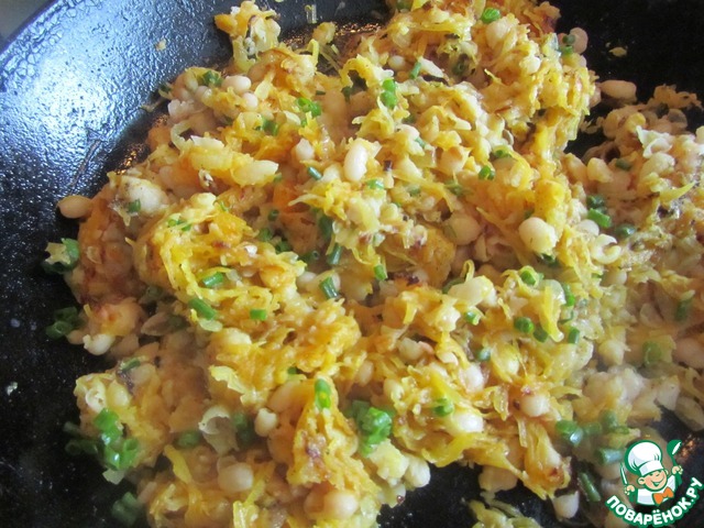 Затем фасоль разминаем вилкой и вместе с измельченным зеленым луком добавляем к тыкве. Солим и перчим по вкусу. Начинка готова. -