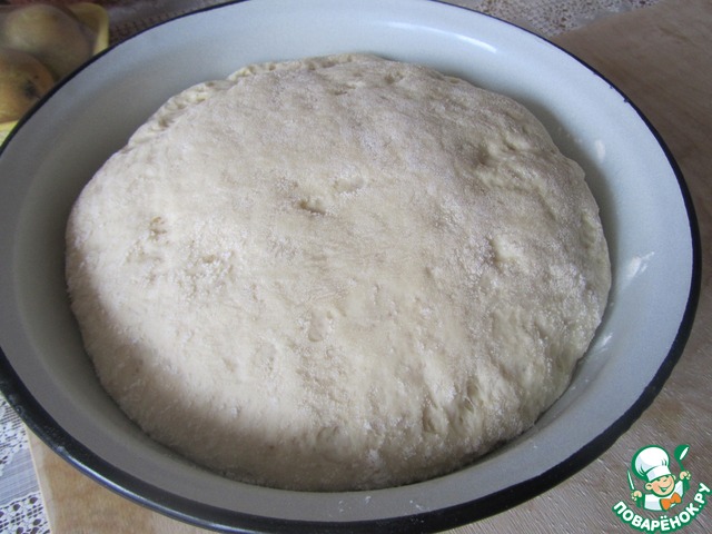 Затем добавляем просеянную муку и замешиваем не крутое мягкое тесто. Оставляем его в теплом месте для подъема на 1,5 часа.