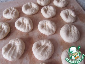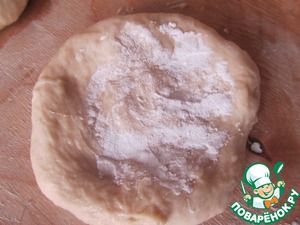 Перед тем как положить начинку посыпаем каждую лепешечку крахмалом, чтобы предотвратить вытекание сока с начинки.