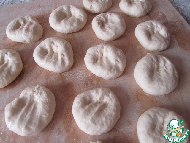 Формуем пирожки, укладываем их на смазанный противень и сверху смазываем яичным белком. Даем пирожкам подойти 10 минут.