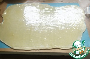 Берем один кусочек теста и очень тонко раскатываем его.