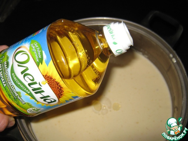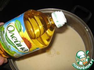 По прошествии времени влить в тесто масло ТМ "Олейна", размешать и можно приступать к выпеканию.