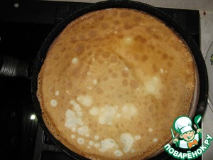 Опрокинуть блинчик на тарелку, смазать сливочным маслом. Испечь остальные (сковороду больше смазывать не нужно). У меня ни одного блинчика не получилось "комом".