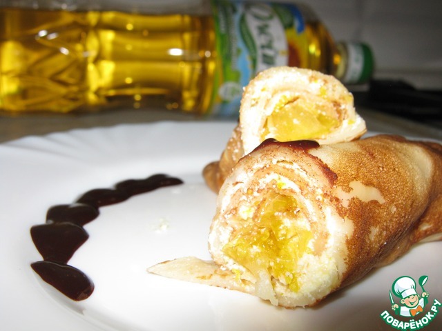 На блинчик равномерно нанести 1 ст. л. творожной начинки, выложить с одного края апельсиновую, свернуть трубочкой, полить соусом.