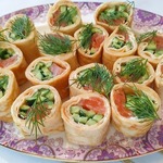 Рецепт «Блинные рулетики с сыром, огурцом и семгой»: