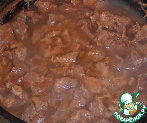 Утиную грудку порезать маленькими кусочками. Высыпать в сковороду и добавить воду. Добавить соль, перец и лавровый лист. Тушить под закрытой крышкой 15 минут.
