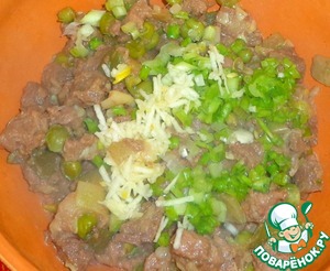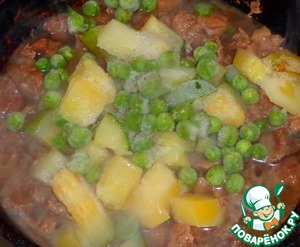 Добавить (по желанию) сежемороженный зеленый горошек. Перемешать и тушить до готовности.