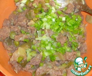 Снять со сковороды мясо с овощами и перемешать с зеленым луком.