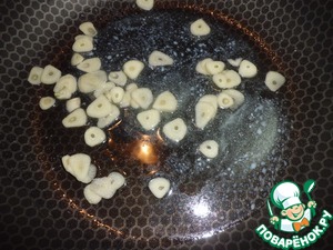 Параллельно обжариваем на растительном масле, с добавлением 1 ст. л сливочного, нарезанный тонкими пластинами чеснок. Минуты 4, до зарумянивания.