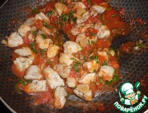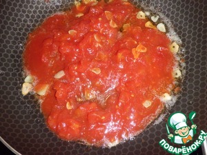 К чесноку отправляем томаты в собственном соку. Я просто слегка порубила их ножом, не стала пользоваться блендером. Солим и добавляем щепотку перца-чили (порошок). Ужариваем до испарения лишней влаги в течении минут 10.