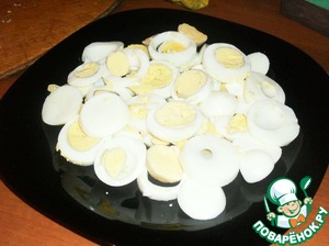 Яйца отварить, почистить и порезать кружочками. Выложить на блюдо первым слоем и слегка смазать майонезом.