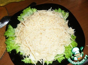 Яблоки почистить, удалить сердцевину и натереть на крупной терке. Выложить их на сыр, промазать майонезом. (не стала фотографировать. Все светлое и плохо видно).