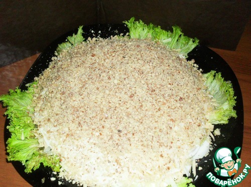 Орехи почистить и измельчить в процессоре. Это последний, пятый слой салата.