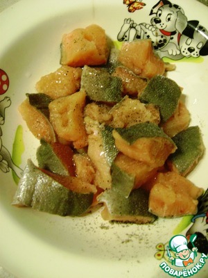 Нарезать крупными кубиками, посолить и поперчить, чуть сбрызнуть маслом и дать промариноваться 30 минут. -